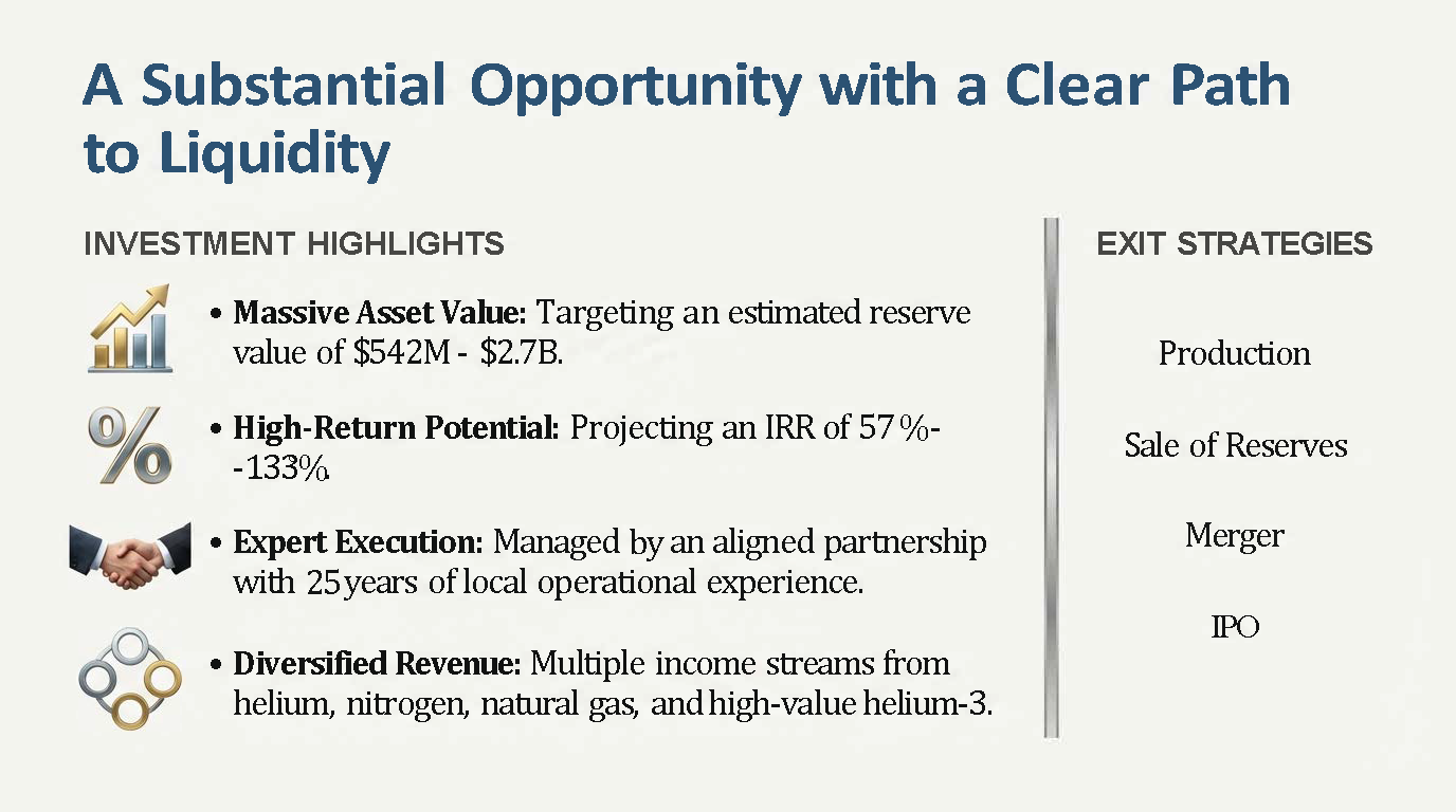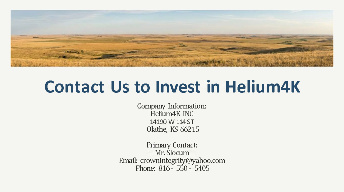 CAUTIONARY STATEMENT CONCERNING FORWARD-LOOKING STATEMENTS. Certain statements contained in this Memorandum that are not statements of historical fact may constitute “forward-looking statements” within the meaning of Section 21E of the Securities Exchange Act of 1934. These statements are subject to risks and uncertainties, as described below. Examples of forward-looking statements include, but are not limited to: (i) projections of revenues, income or loss, earnings or loss per share, capital expenditures, the payment or non-payment of dividends, capital structure and other financial items, (ii) statements of plans and objectives of Helium4K, including plans or objectives relating to the Helium4K wells or other exploration, (iii) statements of future economic performance, and (iv) statements of assumptions underlying the statements described in (i), (ii) and (iii). Forward-looking statements can often be identified by the use of forward-looking terminology, such as “believes,” “expects,” “may,” “will,” “should,” “could,” “intends,” “plans,” “estimates” or “anticipates,” variations thereof or similar expressions. Forward-looking statements are not guarantees of future performance or results. They involve risks, uncertainties and assumptions. The future results of operations, financial condition and business operations may differ materially from those expressed in these forward-looking statements. Investors are cautioned not to put undue reliance on any forward-looking statement. Any forward-looking statement contained herein is made as of the date of this document. The Company does not undertake to publicly update or correct any of these forward-looking statements in the future.